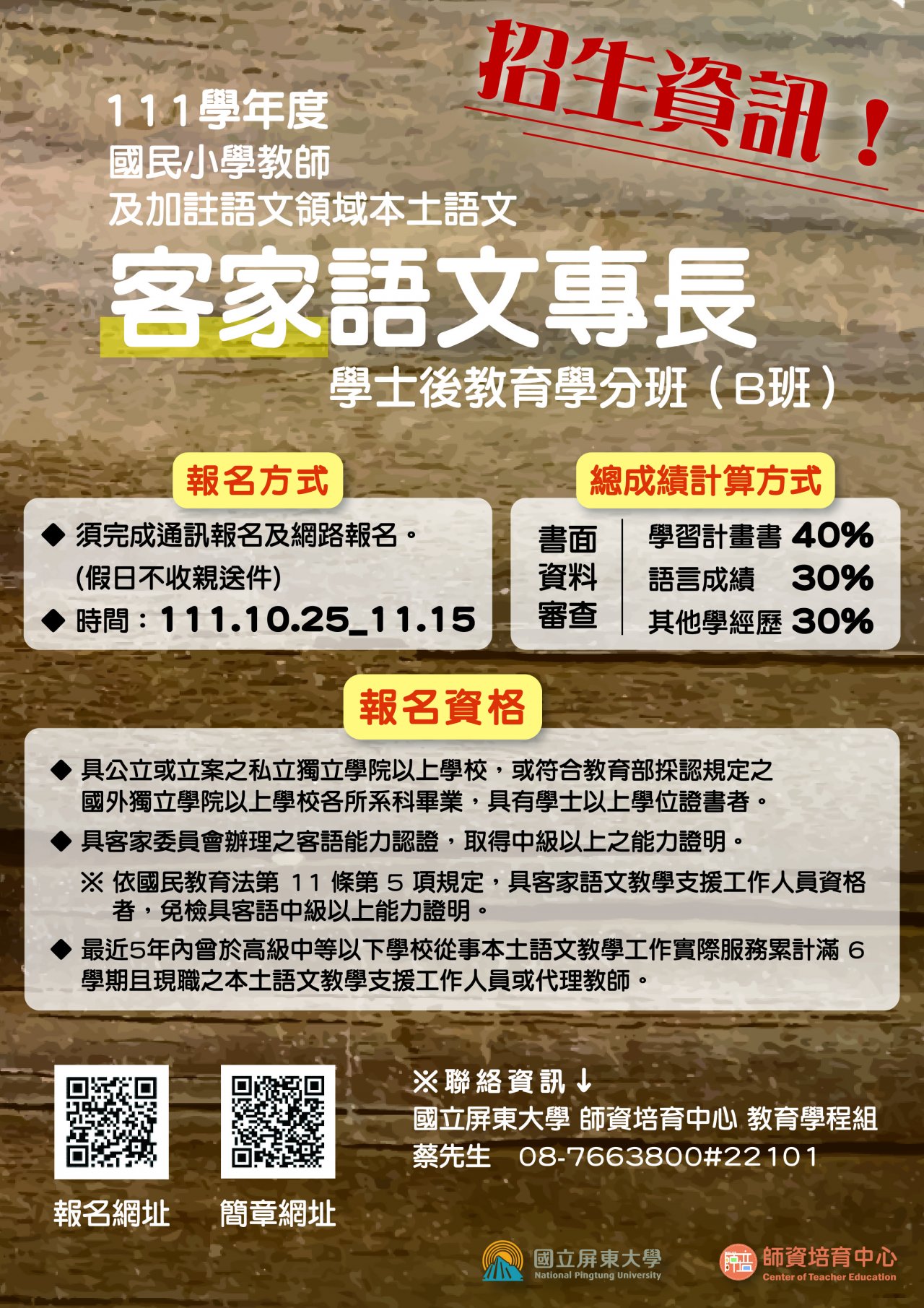 五、聯絡資訊:國立屏東大學師資培育中心教育學程組蔡先生,電話:(08)766-3800分機22101。