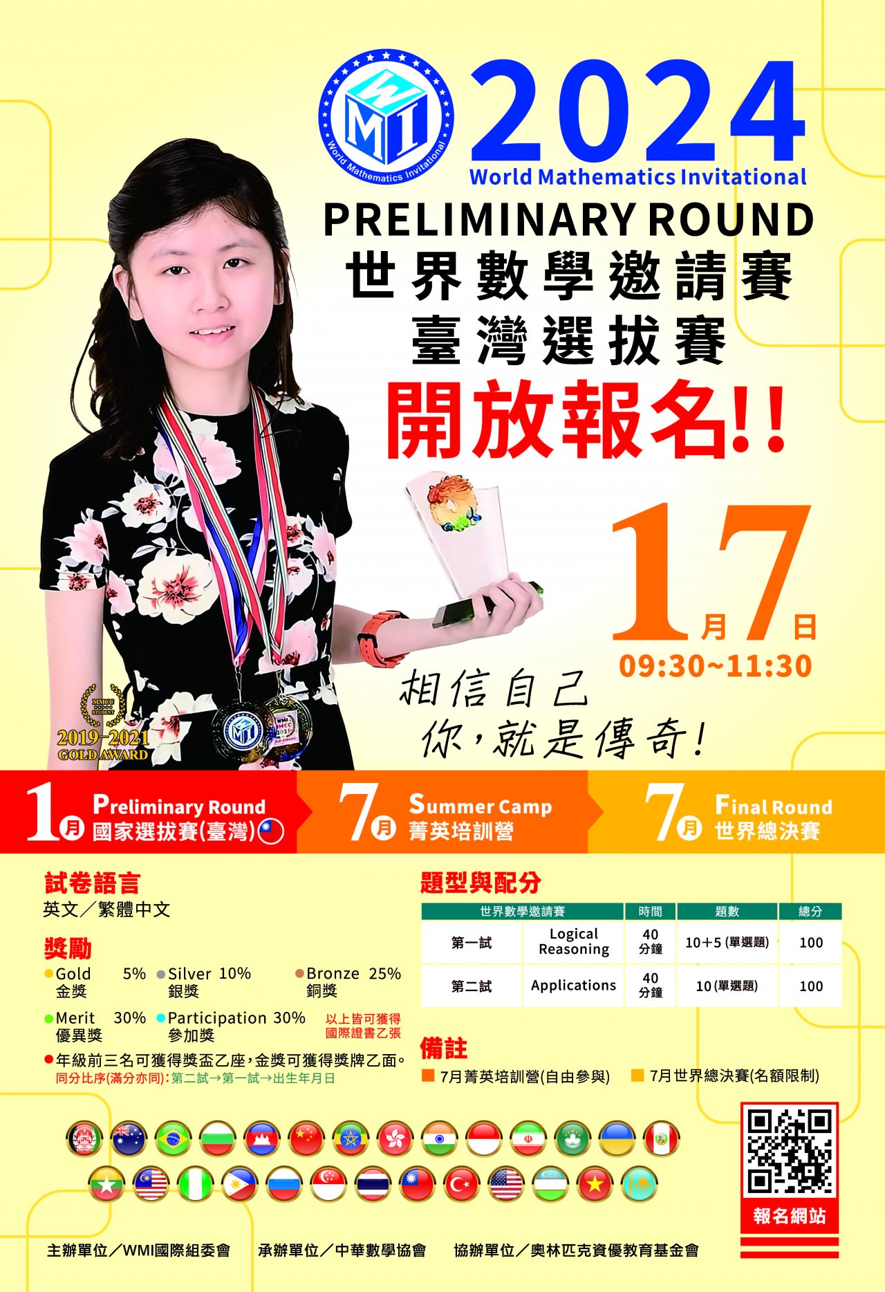 | 三、 | 「WMI世界數學邀請賽-2024臺灣選拔賽」,凡就讀臺灣各縣市之公私立幼兒園至高中三年級之我國籍在學學生,均可報名參加,歡迎愛好數學的學生們踴躍報名,一同響應,為台灣爭取榮耀。 |