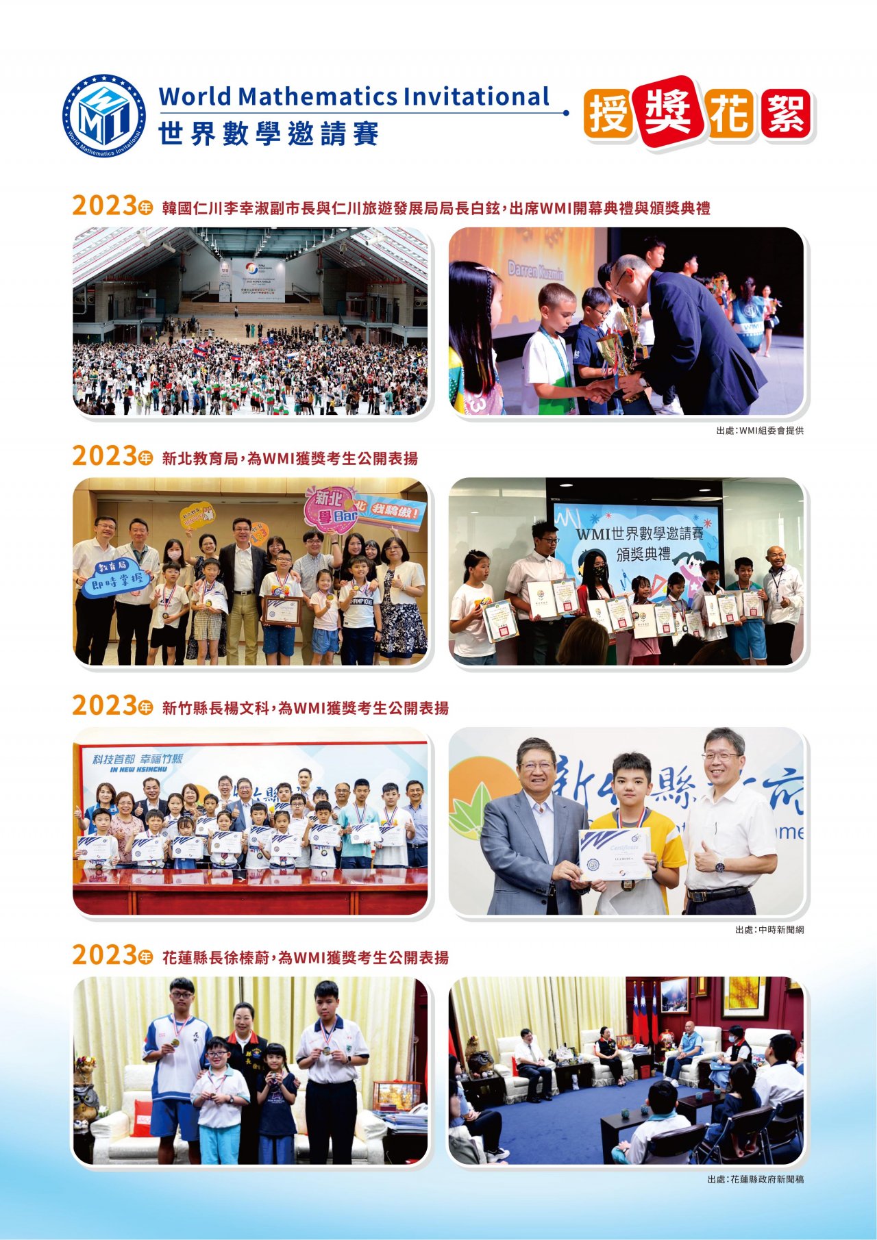 | 二、 | WMI世界數學邀請賽為第一個由台灣發起舉辦的國際性數學競賽,集合世界各地致力於數學推廣組織機構,每年將在不同國舉辦。 |