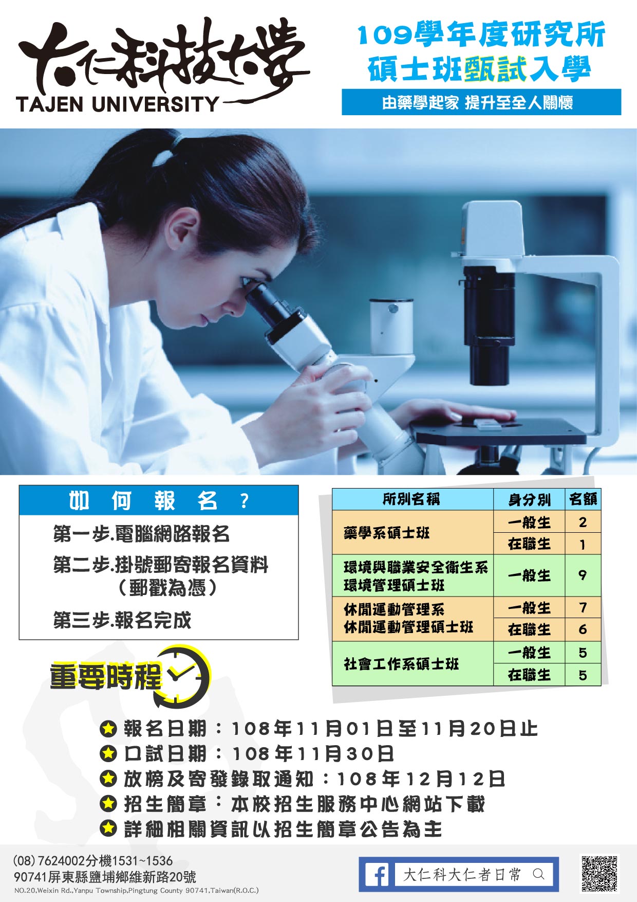 | 主旨: | 有關本校109學年度碩士班甄試入學招生訊息,惠請公告轉知,並鼓勵貴校老師及同仁踴躍報考,請查照。 |
